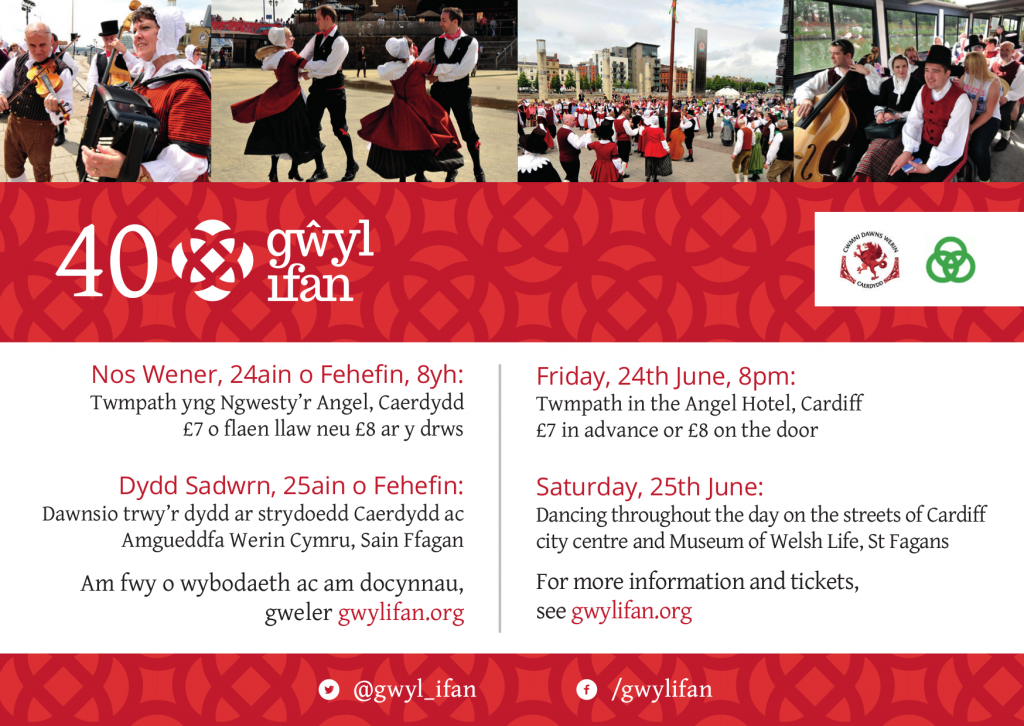 Eleni, wrth ddathlu 40 blynedd, dyma’r ŵyl olaf yn ei ffurf bresennol, gyda thwmpath ar y nos Wener, perfformio’n gyhoeddus ar strydoedd Caerdydd ac Amgueddfa Werin Cymru Sain Ffagan ar y dydd Sadwrn cyn cynnal Taplas gyda’r nos. Bydd hefyd dawnswyr o’r Iseldiroedd, Llydaw, Ffrainc a Chernyw yn ymuno gyda’r dathliadau.